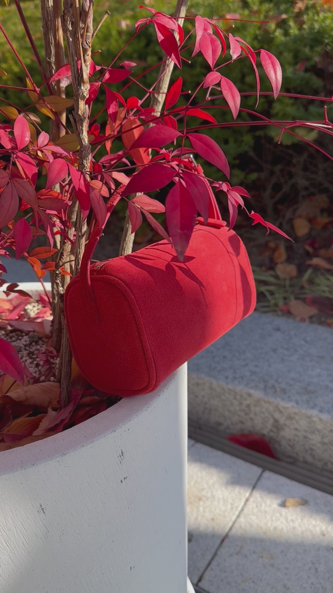 Red Suede Mini Bag crafted from genuine suede in the most vivid shade of red. The mini cylinder shape is playful yet chic, sized perfectly to hold just your absolute essentials—phone, keys, lipstick, and cards.